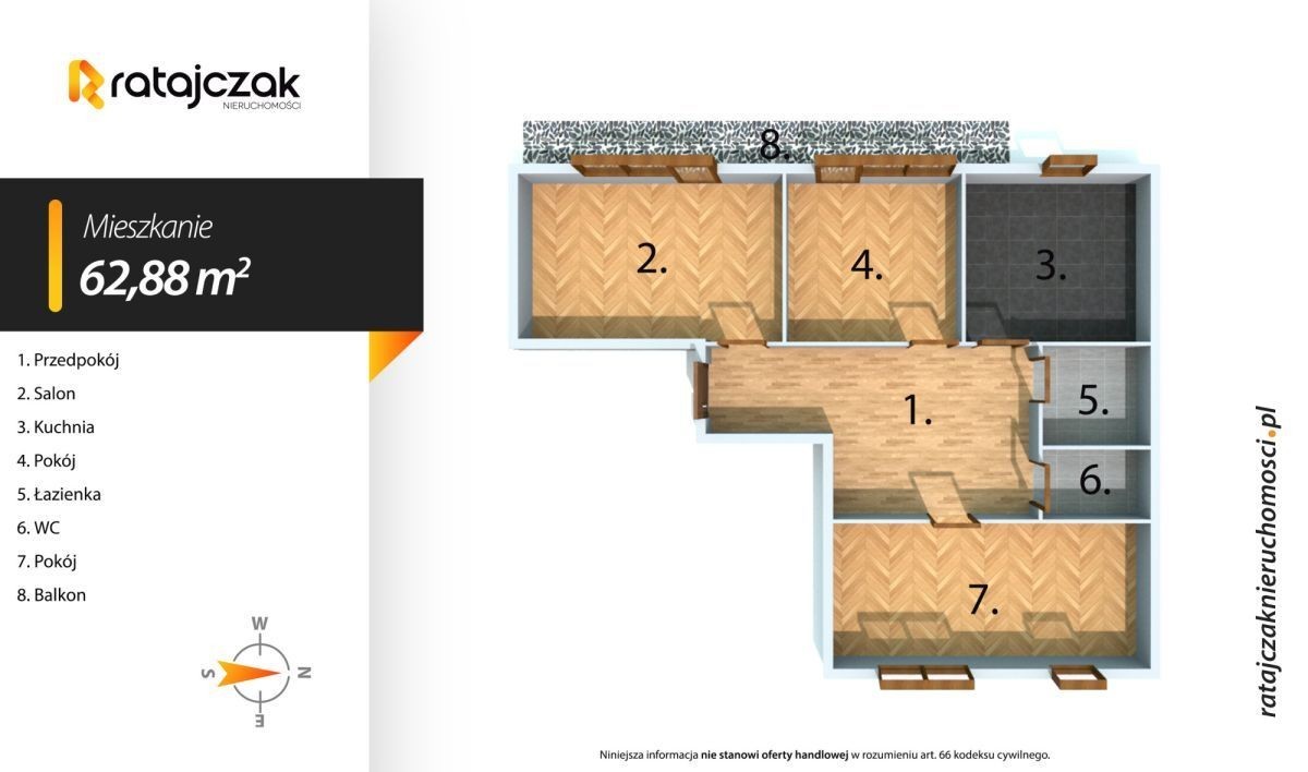 Mamy dla Państwa w ofercie 3 pokojowe mieszkanie o powierzchni 62,88 m2 na ostatnim 11 piętrze w wieżowcu przy ulicy Kochanowskiego w Wejherowie! Istnieje możliwość zamiany na 2 pokojowe mieszkanie w Wejherowie! Mieszkanie zlokalizowane jest w bloku mieszkalnym mieszczącym się przy ulicy Kochanowskiego w Wejherowie. Pod względem bliskości komunikacji oraz wszelkich sklepów, przychodni czy też punktów usługowych jest to jedna z najlepszych lokalizacji w Wejherowie. W promieniu kilkuset metrów znajduje się miedzy innymi: - Centrum Handlowe Jantar - 160 m - Rossamann - 450 m - Biedronka - 450 m - Przychodnia NZOZ Kaszuby - 450 m - Centrum Handlowe Kaszuby - 550 m - przystanek Wejherowo Nanice SKM oraz MZK - 500 m - szkoła podstawowa nr. 11 - 750 m - szkoła podstawowa nr 8 - 800 m i wiele innych. Pod samym blokiem znajduje się boisko do piłki nożnej oraz plac zabaw, a po drugiej stronie ulicy boisko do koszykówki oraz siatkówki. Najbliższy przystanek autobusowy znajduje się w odległości niecałych 200 metrów, a zaledwie 3 min samochodem dzieli nas od dostania się na drogę krajową nr 6, która łączy nas z Trójmiastem. Sprzedawane mieszkanie o powierzchni 62,88 m2 składa się z: trzech odrębnych pokoi, kuchni, łazienki, osobnego wc oraz korytarza. Mieszkanie ma bardzo atrakcyjny układ. Pokoje są przede wszystkim ustawne i pojemne. Mieszkanie jest dwustronne - dwa pokoje oraz kuchnia usytuowana jest od strony zachodniej, a trzeci pokój od strony wschodniej. Mieszkanie posiada dwa balkony od strony zachodniej, z których roztacza się szeroki widok na panoramę okolicy. Balkony znajdują się obok siebie (przy dwóch pokojach), oddzielone są przegrodą, co pozwala na ich niezależne użytkowanie. Zabudowa kuchenna jest utrzymana w dobrym stanie i pełni wyposażona (w lodówkę, zmywarkę, płytę indukcyjną i okap). W pozostałych trzech pokojach znajduje się sporo miejsca na łóżka i pojemne szafy. W korytarzu natomiast mieści się przesuwna szafa oraz idealnie wkomponowana narożna garderoba. Stan techniczny mieszkania określić można jako do remontu lub odświeżenia - w zależności od oczekiwań nowego właściciela. Ściany i sufity szczególnie w pokojach wymagają wyrównania oraz odmalowania, co stwarza możliwość pełnej aranżacji przestrzeni według własnych potrzeb i gustu. Łazienka jest po remoncie, choć miejscami wymaga jeszcze drobnych poprawek. Mieszkanie mieści się w 11 piętrowym wieżowcu wybudowanym w latach 80-tych. Wokół budynku znajdują się ogólnodostępne miejsca parkingowe. Klatka schodowa zabezpieczona jest domofonem. W budynku jest oczywiście winda. - Mieszkanie 3 pokojowe, 62,88 m2 na 11 piętrze w Wejherowie przy ulicy Kochanowskiego - Do mieszkania przynależy pomieszczenie piwniczne - Termin wydania: do 3 miesięcy po sprzedaży, - Uśredniony czynsz wynosi około 600 zł - Stan prawny: spółdzielczo własnościowe prawo do lokalu - Dla lokalu zostało sporządzone świadectwo charakterystyki energetycznej Jeśli szukasz 3 pokojowego mieszkania w doskonałej lokalizacji, z pełnym zapleczem handlowo-usługowym w pobliżu oraz z pięknym widokiem - jest to oferta skierowana właśnie do Ciebie! Zobacz jak nieruchomość prezentuje się na żywo! Zainteresowanym klientom udzielę szczegółowych informacji! Zapraszam do kontaktu i na prezentację! Jeżeli zainteresowało Cię powyższe ogłoszenie to: - Zadzwoń pod wskazany nr tel. - Umów się na Prezentację, - Przyjedź i Obejrzyj na żywo, - Zaproponuj Swoją cenę prezentowanej nieruchomości. Gwarantujemy bezpieczny zakup i najlepszą CENĘ. Oferujemy skuteczną i bezpłatną pomoc w uzyskaniu kredytu. Zapewniamy fachowe doradztwo przy zakupie pod inwestycję. Wszystkie nasze transakcje są objęte ubezpieczeniem OC w PZU. Z nami u Notariusza otrzymasz Ofertę Specjalną. Więcej podobnych ofert znajdziesz na naszej stronie: