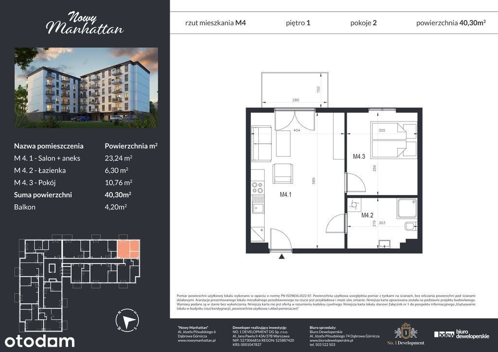 Na sprzedaż dwupokojowe mieszkanie o powierzchni 40,30 m2 zlokalizowane w Dąbrowie Górniczej przy Al. Józefa Piłsudskiego 6. Mieszkanie zlokalizowane na pierwszym piętrze w pięciopiętrowym, nowo wybudowanym bloku. Układ mieszkania: przedpokój, łazienka, sypialnia, przestrzeń dzienna z aneksem kuchennym i balkon. Możliwość zakupu komórki lokatorskiej, garażu lub miejsca parkingowego. Nowy Manhattan to nowe osiedle mieszkaniowe realizowane w Dąbrowie Górniczej przy Al. Józefa Piłsudskiego 6, w ramach którego powstanie jeden pięciopiętrowy blok mieszkalny, w którym swoje idealne miejsce do życia znajdzie 60 rodzin. Funkcjonalne układy mieszkań i wysokości pomieszczeń nawet 285 cm wpłyną na komfort przyszłych mieszkańców. Do każdego z mieszkań przynależał będzie przestronny balkon. Na każdym piętrze budynku znajdować się będą komórki lokatorskie, w których ich nabywcy będą mogli przechowywać np. rowery. Na parterze budynku zaprojektowane zostało 30 indywidualnych garaży z automatycznymi zdalnie sterowanymi bramami. Dodatkowo na terenie inwestycji powstanie 30 naziemnych miejsc parkingowych. W budynku znajdować się będzie nowoczesna cichobieżna winda. Teren osiedla zostanie ogrodzony. Planowany termin zakończenia prac budowlanych i uzyskania pozwolenia na użytkowanie budynku to grudzień 2025 roku. Bezpośrednie sąsiedztwo zabudowy wielorodzinnej gwarantuje dostęp do wszelkich sklepów i usług w zasięgu kilkuminutowego spaceru. W promieniu kilkuset metrów znajdują się popularne supermarkety i mniejsze sklepiki, apteki, wszelkie usługi, a także przystanki komunikacji miejskiej pozwalające w kilkanaście minut dostać się do sąsiadujących miast takich jak Sosnowiec, Będzin, Czeladź, czy Katowice. Również droga do najbliższego przedszkola, szkoły podstawowej czy liceum nie zajmie więcej niż kilka minut. Osoby podróżujące do pracy samochodem na pewno docenią szybki wylot na trasę DK94 w kierunku Katowic i Krakowa. Dąbrowa Górnicza słynie z terenów rekreacyjnych! Dlatego warto wiedzieć, że dojazd rowerem z Nowego Manhattanu do molo na jeziorze Pogoria III zajmie niecały kwadrans. Polecam i zapraszam do kontaktu Oferta wysłana z programu dla biur nieruchomości ASARI CRM ()