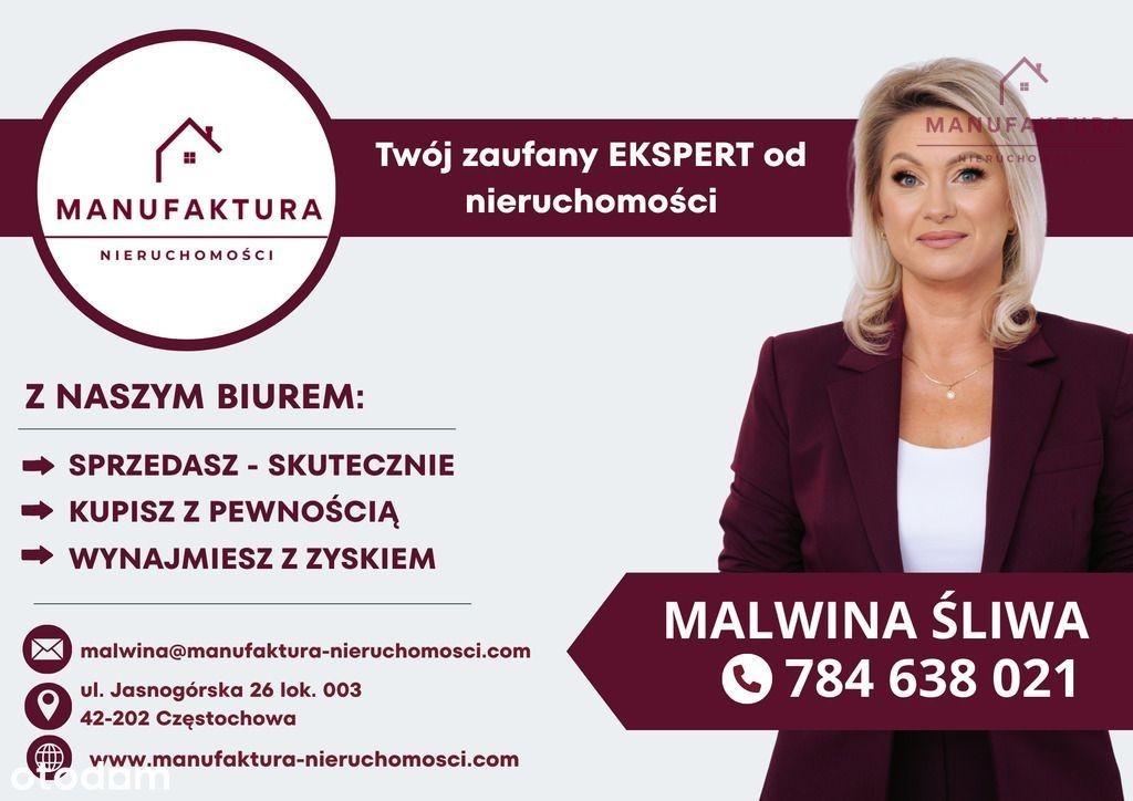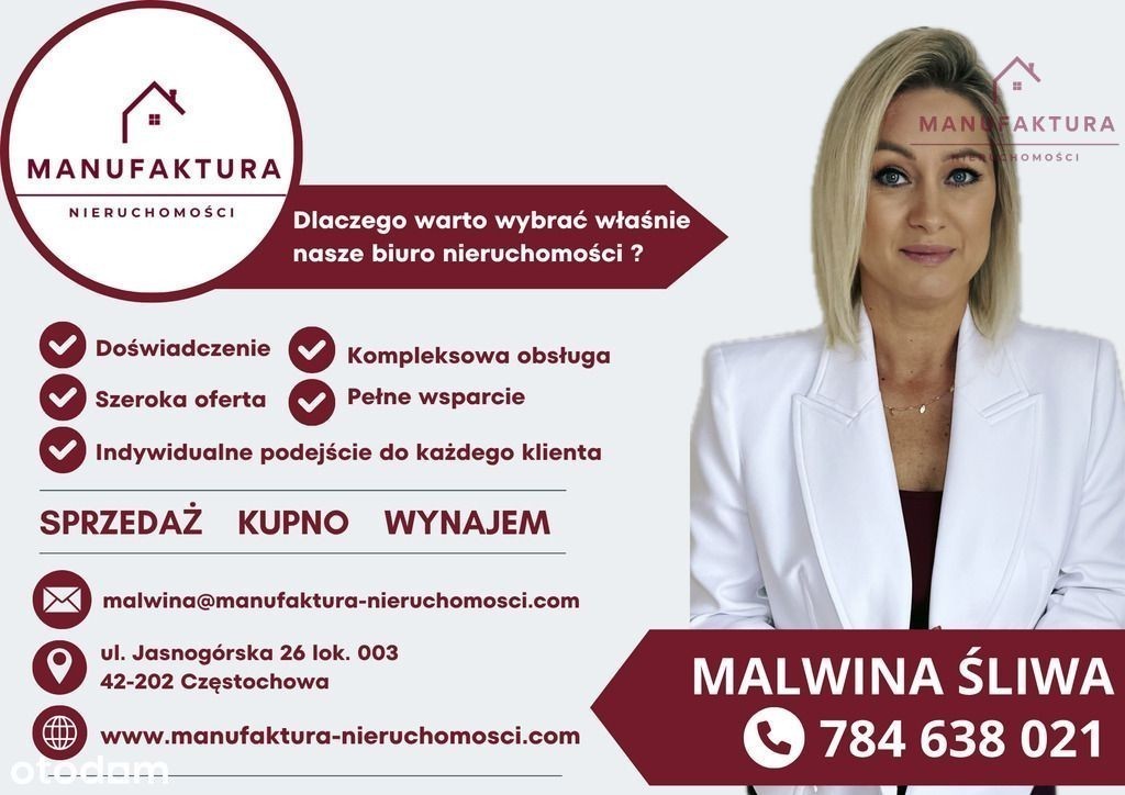 Manufaktura Nieruchomości prezentuje Państwu na wynajem słoneczną kawalerkę położoną w sercu miasta u podnóża Jasnej Góry. Powierzchnia nieruchomości to 30m2, na którą się składa : salon z wyjściem na duży balkon, kuchnia oraz łazienka. Mieszkanie w 2021 roku przeszło kapitalny remont podczas, którego zostały wymienione wszystkie instalacje w tym gazowa, elektryczna i wodno - kanalizacyjna. Okna PCV. Drzwi antywłamaniowe. Na podłogach panele oraz płytki. Na ścianach gładzie gipsowe. Mieszkanie jest kompletnie umeblowane i wyposażone w pralkę, lodówkę, kuchenkę elektryczną. Nieruchomość mieści się na 2 piętrze w niskim bloku z cegły. Blok po termomodernizacji. Klatka czysta, zadbana, zabezpieczona domofonem. Przed klatką bezpłatny parking dla mieszkańców. Świetna lokalizacja ! Nieruchomość mieści się przy Al. NMP 62 w samym sercu miasta z widokiem na Jasną Górę. Po wyjściu z klatki mamy wszystko co potrzebne do życia : sklepy, przychodnie, apteki, restauracje, kawiarnie, szkoły i wiele innych. Tuż obok piękny Park Jasnogórski, Ośrodek Kultury Filmowej, Korty Tenisowe, Basen, Siłownia, Fitness, dla miłośników książek Empik. Kwota Najmu : 1350 zł Czynsz Administracyjny : 650 zł Kaucja : 2000 zł Jeśli szukasz mieszkania na wynajem w topowej lokalizacji to ta oferta jest właśnie dla Ciebie ! Pomagamy w uzyskaniu korzystnego kredytu, zapewniamy wsparcie Notariusza oraz wykonujemy świadectwa charakterystyki energetycznej. Informacje zawarte w ofercie są sporządzone na podstawie oględzin nieruchomości, a także danych uzyskanych od właściciela. Oferta nieruchomości ma charakter wyłącznie informacyjny, może podlegać aktualizacji oraz nie stanowi oferty handlowej w rozumieniu art. 66 Kodeksu Cywilnego. Oferta wysłana z programu dla biur nieruchomości ASARI CRM ()