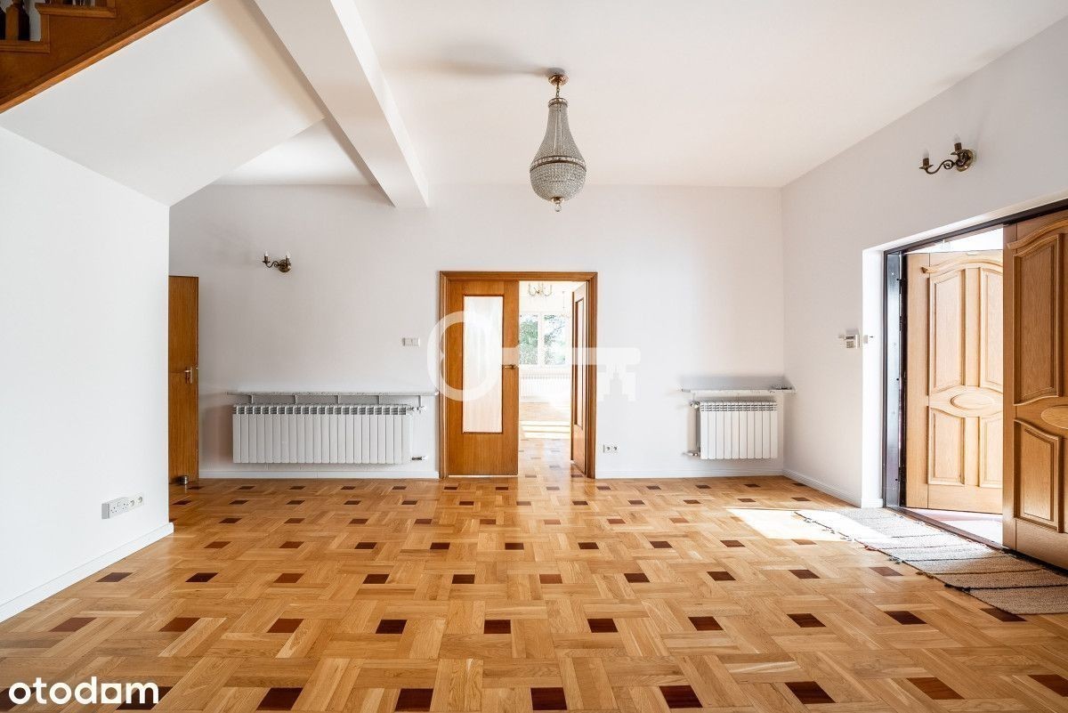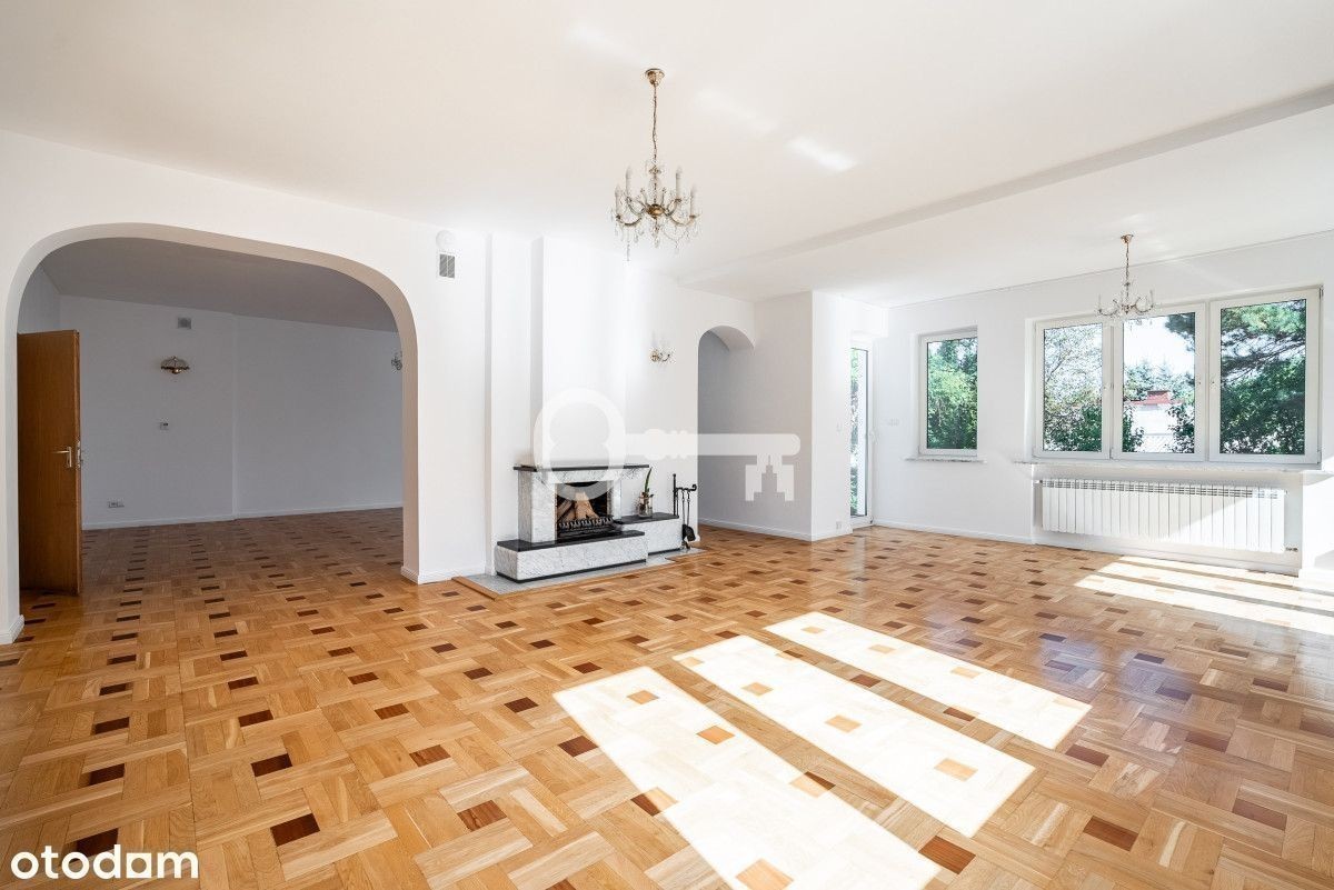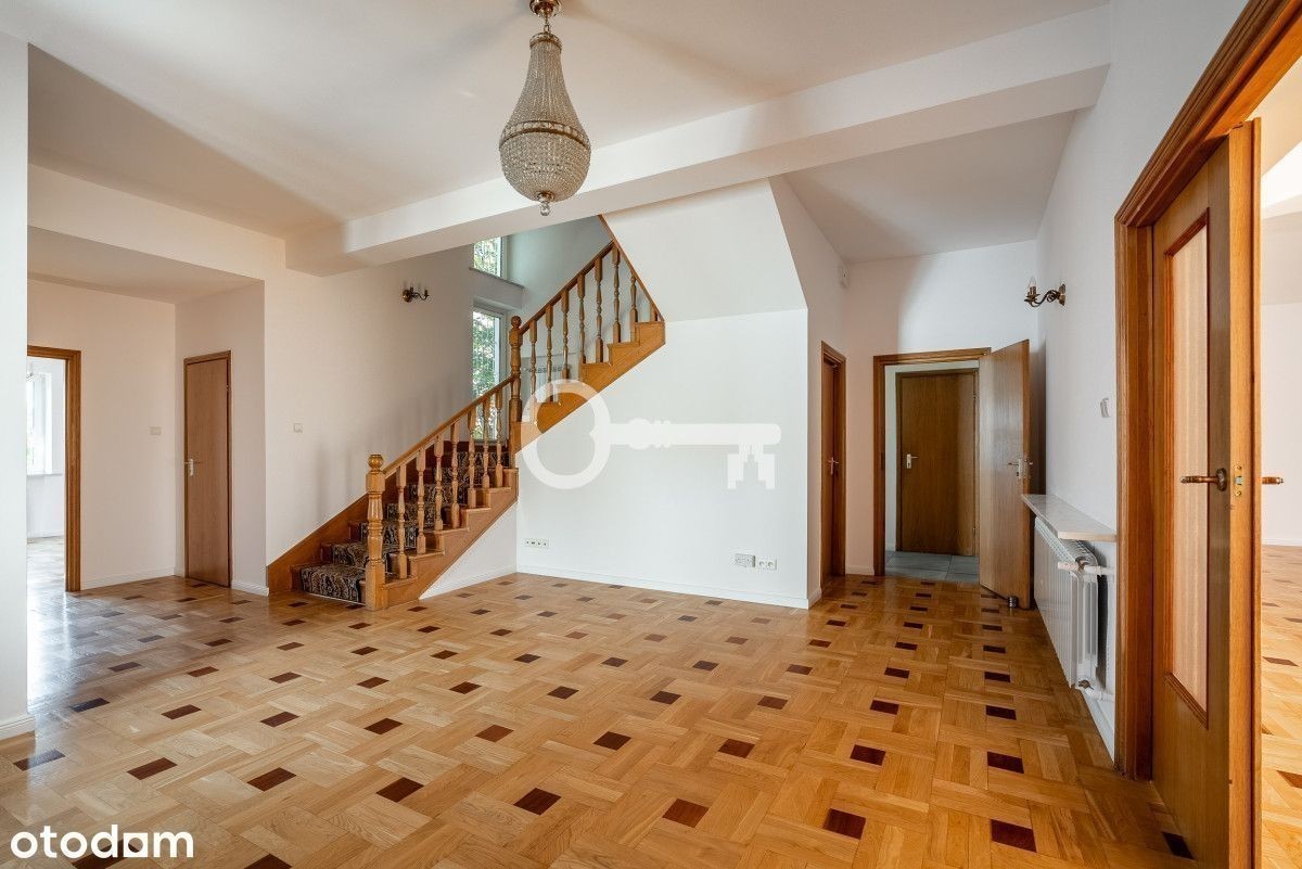 REZYDENCJA NA WYNAJEM W WILANOWIE! 8 sypialni | 4 łazienki + 2 toalety | Powierzchnia recepcyjna 192 m² | Klimatyzacja | Sauna i gym | Garaż na 2 auta + 3 miejsca parkingowe na posesji | Bezpieczeństwo Konsalnet | Ogród ekreacyjny | Kapitalny remont w 2020 r. Parter (192 m² powierzchni recepcyjnej): * przestronny hall wejściowy, * elegancki salon z biało-czarnym marmurowym kominkiem, * jadalnia, * kuchnia po generalnym remoncie (nowe szafki, sprzęt AGD: zmywarka, lodówka, piekarnik, mikrofalówka, płyta indukcyjna), * spiżarnia / magazyn przy kuchni, * gabinet / biuro domowe, * toaleta dla gości. Piętro I: * 4 sypialnie jedno- lub dwuosobowe, każda z garderobą, * 2 łazienki w całości wyłożone glazurą, * pralnia. Piętro II: * 3 pokoje (w tym pokój rekreacyjny dla dzieci), * łazienka, * dwa tarasy z widokiem na ogród. Piwnica: * pokój rekreacyjny/bankietowy z dębową klepką, * pomieszczenie przygotowane pod saunę i gym, * pralnia, * pomieszczenia techniczne, * garaż na 2 samochody. Dom przeszedł kapitalny remont w 2020 roku, podczas którego wymieniono instalacje wodne, elektryczne i sanitarne. Posiada światłowodowy internet Orange oraz rozprowadzone kable telewizyjne. W głównych pokojach na parterze i pierwszym piętrze zainstalowano klimatyzację. Bezpieczeństwo zapewnia system alarmowy Konsalnet z ochroną i czasem reakcji do 3 minut, a także nowe okna antywłamaniowe ze specjalnymi szybami i okuciami. Wykończenie wnętrz obejmuje parkiet dębowy, elegancką mozaikę dębowo-mahoniową, marmurowe parapety oraz dębowe schody i balustrady. Komfort codziennego użytkowania podnoszą wideodomofon, automatyczna brama wjazdowa i drzwi garażowe. Ogrzewanie zapewnia system gazowy Junkers/Bosch wraz z instalacją wodną Hydroterm i miedzianymi rurami wyposażonymi w filtry. Dach oraz orynnowanie wykonane są z miedzi. od frontu reprezentacyjne wejście dla gości pieszych, dwie bramy wjazdowe - jedna do garażu (2 auta), druga na wewnętrzny parking dla gości (3 auta), od strony ogrodu część rekreacyjna w stylu kaskadowym - tarasy, trawnik i kwietniki, system automatycznego podlewania, oświetlenie bezpieczeństwa wokół posesji. Prestiżowa część Wilanowa, w otoczeniu zieleni i rezydencji. Doskonała propozycja dla rodziny, dyplomatów lub jako elegancka rezydencja reprezentacyjna. W pobliżu liczne prestiżowe szkoły i przedszkola. Szybki dojazd do centrum. * Nieruchomość gotowa do wynajmu. * Dodatkowo płatny prąd, gaz, wywóz odpadów.