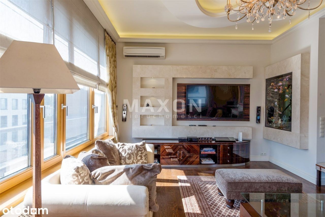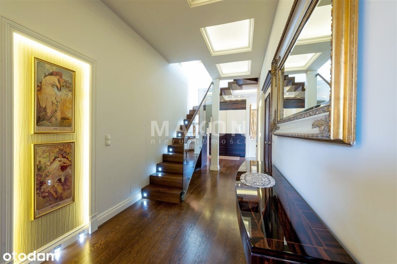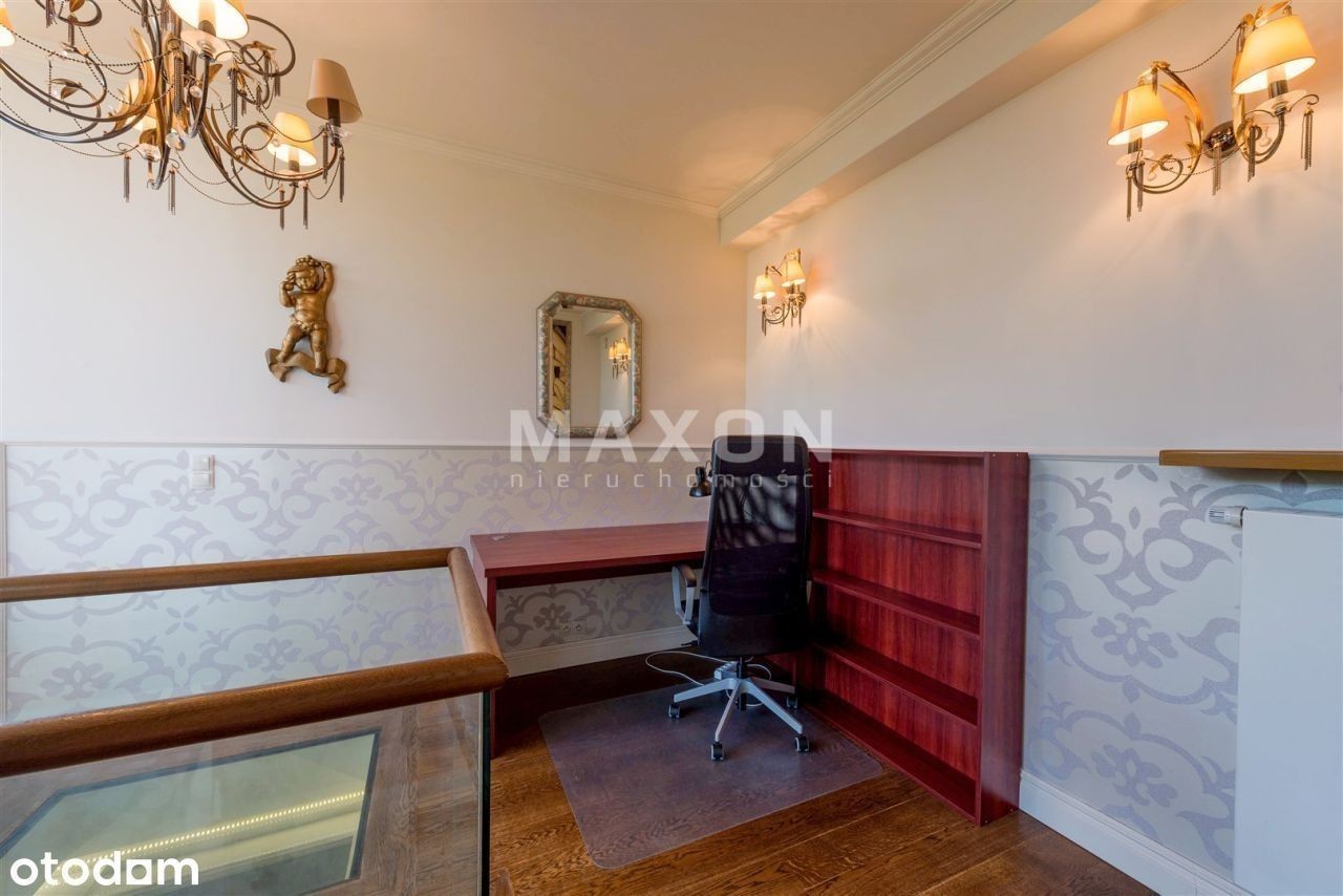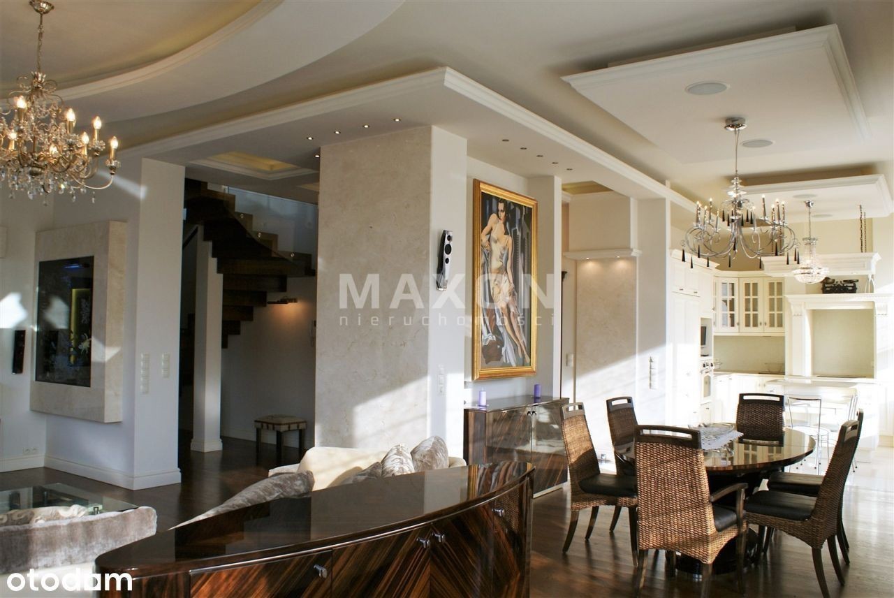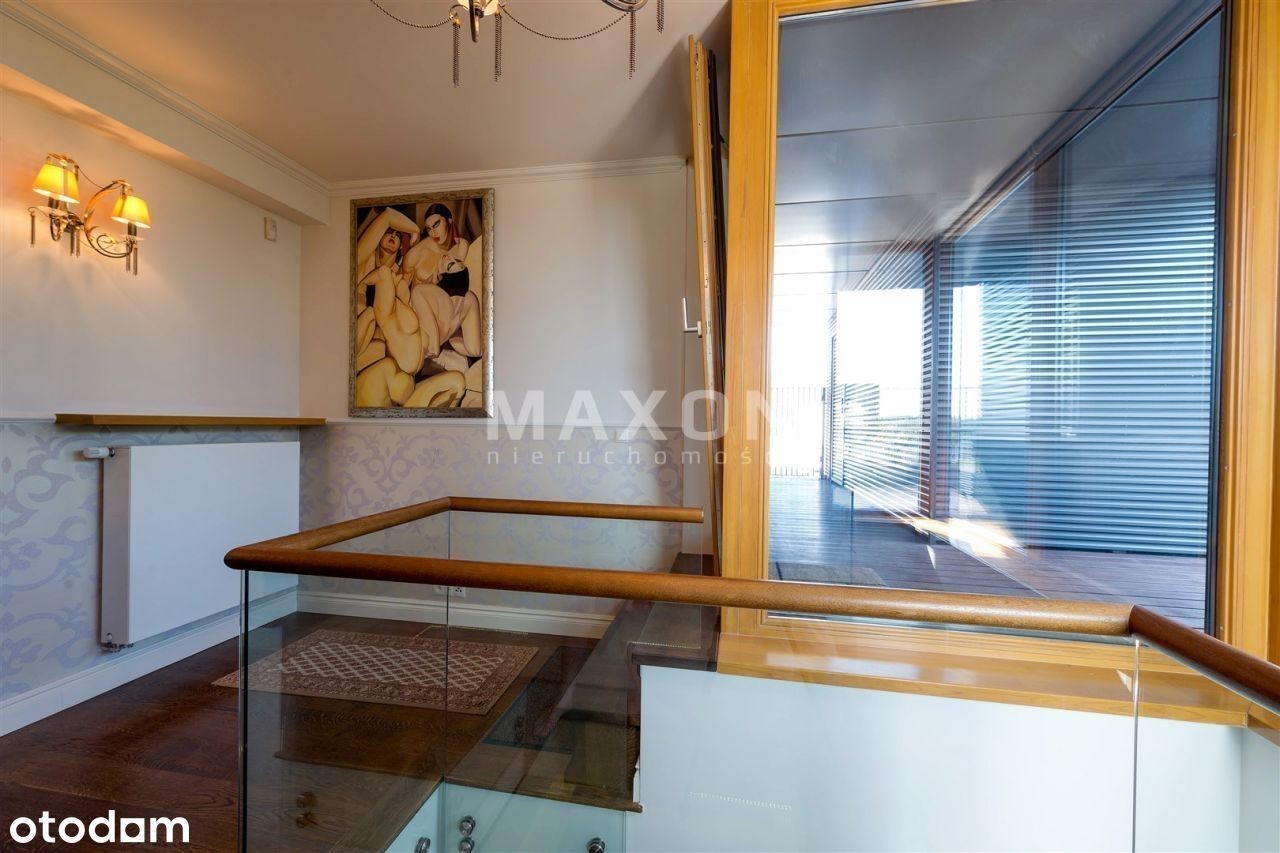 Ekskluzywny penthouse o powierzchni 175 mkw., z balkonem oraz dużym, 110 mkw. tarasem i ogrodem na dachu budynku zlokalizowanego na granicy dzielnic Mokotowa i Wilanowa. Na IV piętrze, dobrze doświetlony, słoneczny. W świetnej lokalizacji, w bezpośrednim sąsiedztwie rezerwatu przyrody. Apartament z widokiem na trzy strony świata, wykończony w. Podłogi z naturalnego kamienia oraz desek z dębu w kolorze orzecha. W salonie kominek z białego marmuru. Kuchnia w pełni wyposażona w sprzęt AGD, z wyspą, blat z kamienia. W ścianie dzielącej hol od salonu, olbrzymie, widoczne z obu stron i całkowicie zautomatyzowane akwarium. We wszystkich oknach rolety zewnętrzne, moskitiery, rolety wewnętrzne rzymskie i zasłony. Apartament wyposażony w ogrzewanie podłogowe, systemy: automatycznej klimatyzacji, podtynkowy system audio i TV, instalacje: domofonową, internetową, kablową, telefoniczną, satelitarną oraz centralny wyłącznik światła. Wysokość pomieszczeń 3,2 m. Rozkład pomieszczeń: - reprezentacyjny połączony z oraz wyjściem na, - duża, pięknie rozplanowana, - główna z ponadwymiarowym prysznicem oraz wyjściem na, - ze stylową, robioną na zamówienie biblioteką i kanapą, - dla dzieci z piętrowym łóżkiem, - łazienka z wanną i naściennym tv, - oddzielna toaleta z pisuarem i umywalką, - pomieszczenie gospodarcze i pralnia. Czynsz administracyjny: Ogrzewanie: Woda: Prąd: Gaz: Internet: TV kablowa/sat.: Miejsce postojowe: Kaucja : Czynsz adm. Woda : Prąd : Ogrzewanie : Gaz : Internet : TV Kablowa / sat. Miejsce postojowe : Rodzaj : Stan lokalu : Umeblowanie : Salon : Kuchnia : Liczba łazienek : Lb. oddzielnych toalet : Rok budowy : Stan budynku : Winda : Udog. dla niepełnosprawnych : Teren ogrodzony : Ochrona : Liczba balkonów : Balkon : Liczba tarasów : Piwnica : Komórka : Ogród : Klimatyzacja : Ogrzewanie : Ciepła woda : Gaz : Wyposażenie łazienek : Wyposażenie kuchni : Parking podziemny : Dostępne w okolicy : Transport publiczny : Nasze usługi świadczymy w oparciu o umowę pośrednictwa, która gwarantuje Państwu. Za wykonaną usługę pobieramy wynagrodzenie zgodnie z warunkami uzgodnionymi w zawartej umowie (za wyjątkiem umów zawartych w programie 0%). Prezentowane oferty nie stanowią oferty w rozumieniu Kodeksu Cywilnego. Staramy się, aby informacje dotyczące oferowanych obiektów były możliwie dokładne, kompletne i aktualne. Ze względu na okoliczności, iż informacje te pochodzą od osób trzecich i część z nich nie zawsze daje się zweryfikować, MAXON Nieruchomości Sp. z o.o. nie ponosi odpowiedzialności za ich dokładność, kompletność i aktualność