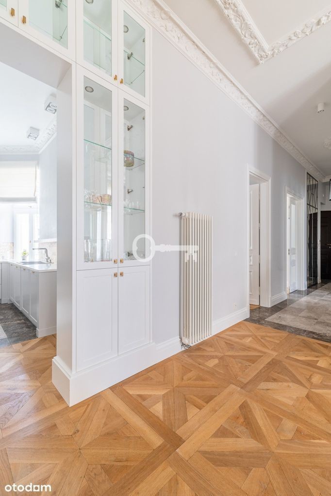 APARTAMENT W ZABYTKOWEJ KAMIENICY Unikalna lokalizacja | Zabytkowa kamienica | Wysokie sufity | 2 miejsca parkingowe Przepiękny apartament w kamienicy, nietuzinkowe, pełne elegancji wnetrze urzeka przytulnością, przestrzenią i niepowtarzalnym stylem. Część dzienna to : * Przestronny hol z szafą, * częściowo otwarta przestrzeń, w której urządzono salon, jadalnię i otwartą kuchnię, * tuż przy kuchni duża przestronna spiżarnia, * doskonale doświetlony pokój dzienny z prawie 4 metrową wysokością i z bio kominkiem, * gabinet, * łazienka z prysznicem, * korytarz - biblioteka to przejście do części prywatnej. W części prywatnej: * Sypialnia, * garderobą z imponującą ilością szaf, * w pełni wyposażona łazienka (jedna z wanną i z prysznicem) obie ładnie doświetlone światłem dziennym, * w holu przejściowym dużą biblioteka. Historyczna kamienica z lat 20. XX wieku, po generalnym remoncie. Zarówno elewacja jak i klatka schodowa zostały odrestaurowane. Kameralna klatka schodowa wykończona marmurem, jednolite, bogato zdobione drzwi do wszystkich mieszkań. Tylko 2 lokale na piętrze. Ulica Wiejska między Placem Trzech Krzyży a Sejmem to cicha, elegancka i wygodna lokalizacja, często poszukiwana przez naszych klientów. Trzy kroki od kamienicy są dwa bistra ze świetnymi śniadaniami i obiadami, jest restauracja z kuchnią tajską i kultowa kawiarnia "Czytelnik". Jednolity charakter zabudowy, sąsiedztwo parków, bliskość ulicy Mokotowskiej z licznymi butikami i kawiarniami czyni to miejsce nie tylko wyjątkowym na mapie Warszawy, ale przede wszystkim bardzo wygodnym i urokliwym miejscem do zamieszkania. * Do apartamentu przynależą 2 miejsca parkingowe. -