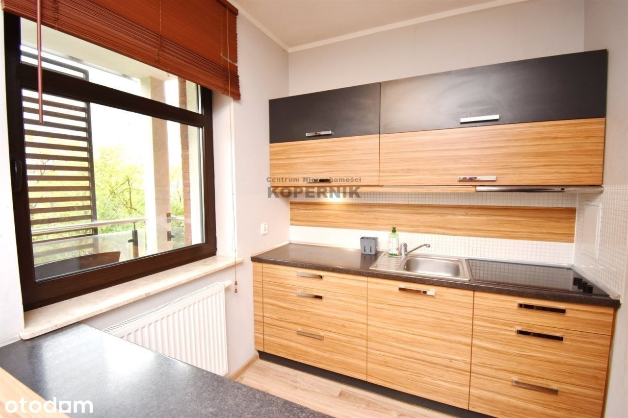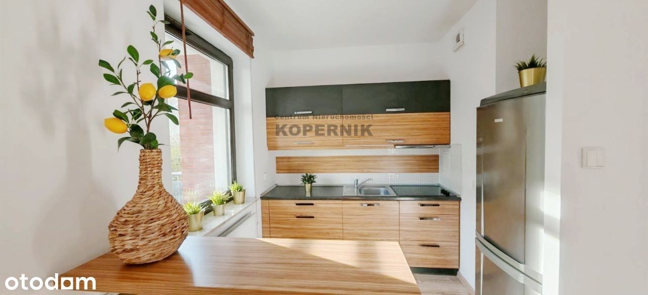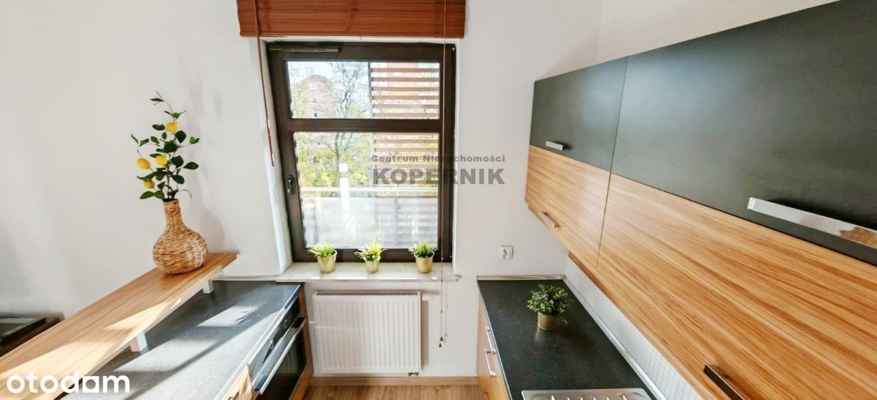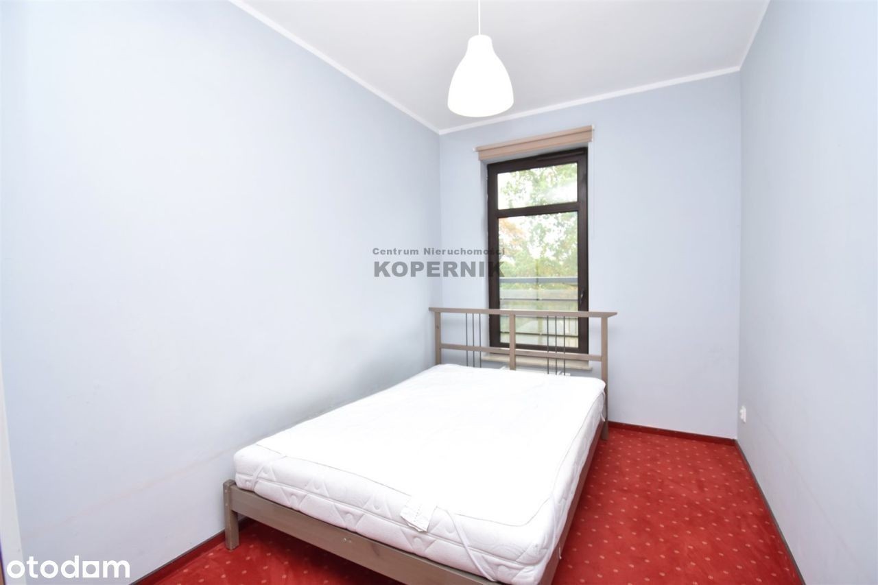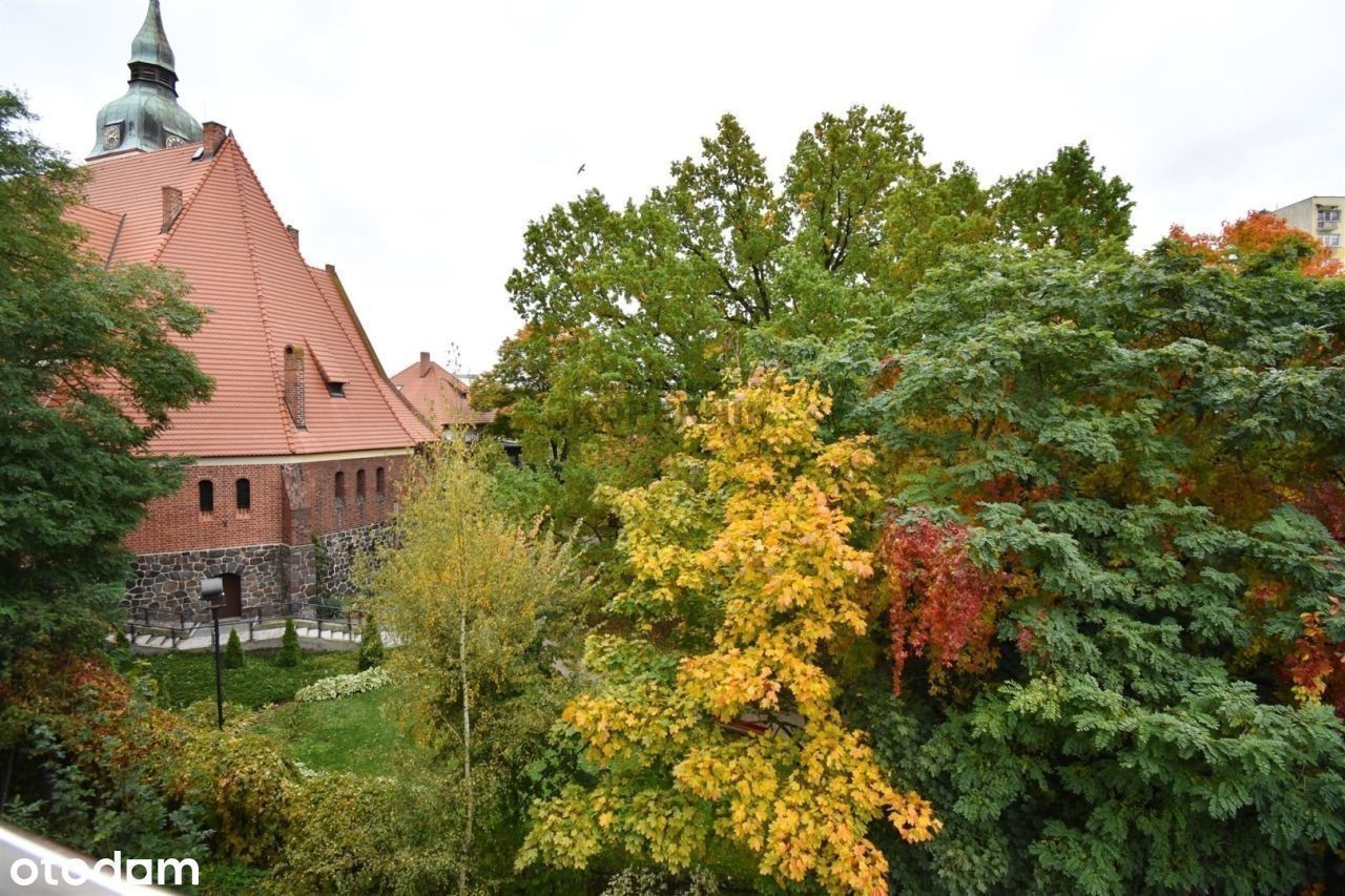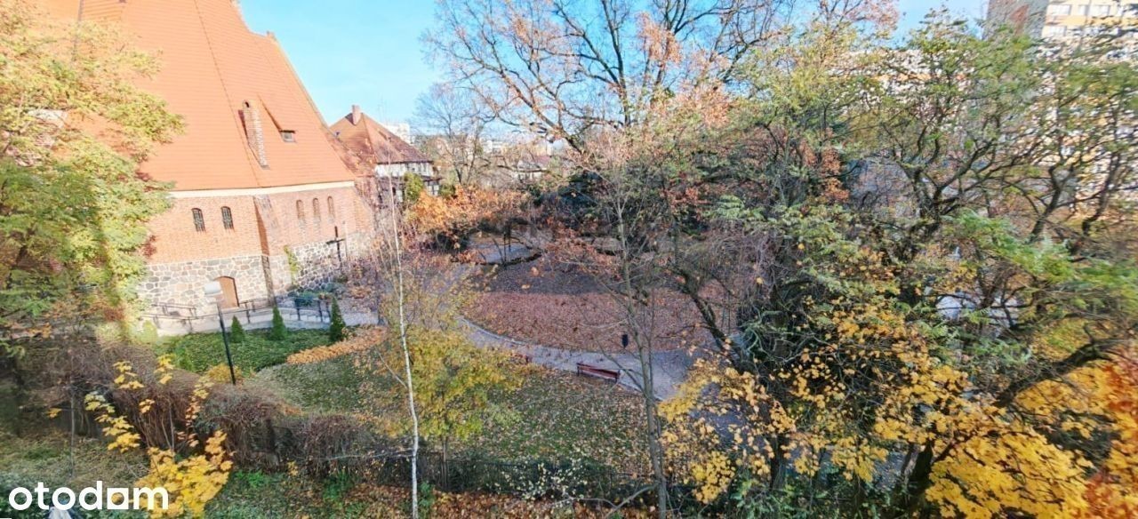 REWELACYJNA OFERTA W SERCU TORUNIA - widok na skwer z przepięknymi drzewami i podświetlony kościół Toruń, ul. Podgórna, osiedle Mokre