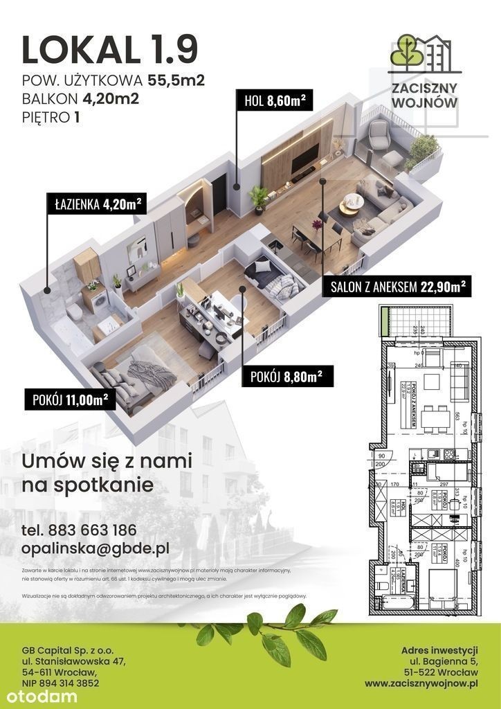 Jasne, komfortowe 3-pokojowe mieszkanie z dużymi oknami w inwestycji "Zaciszny Wojnów"! Zakończenie budowy już na jesień 2025! / Możliwość rabatu i negocjacji ceny / Złóż swoją ofertę już dziś! Wybierz dla siebie mieszkanie - Odwiedź naszą stronę internetową - Obejrzyj inwestycji: Znajduje się na NA OTODOM w polu -> Oferujemy do sprzedaży 3-pokojowe mieszkanie w stanie deweloperskim o powierzchni 55,5 m2, usytuowane na pierwszym piętrze budynku w inwestycji Nieruchomość składa się z przestronnego salonu połączonego z aneksem kuchennym, szerokiego holu prowadzącego do 2 niezależnych sypialni, a także do łazienki z WC. Wyjście na duży balkon dostępne jest bezpośrednio z salonu, poprzez szerokie okno tarasowe. Mieszkanie jest bardzo jasne i słoneczne ze względu na duże przeszklenia. Mieszkanie zostało zaprojektowane z myślą o wygodzie użytkowania dla całej rodziny. - to przemyślany projekt za którym przemawiają konkretne atuty: - okolica blisko udogodnień miejskich. - nowoczesny projekt funkcjonalnych mieszkań; - materiałów; - duże przeszklenia, ocieplenie budynku; - możliwość podłączenia; - mieszkania parterowe z ogródkiem, na piętrze z balkonami; - na dachu; - w lokalach na parterze; - garaże i postojowe dla mieszkańców. - to doświadczony deweloper, który już z sukcesem, pasją i zaangażowaniem realizuje Wrocławskie inwestycje. Zaciszny Wojnów to wyjątkowa inwestycja, położona we wschodniej części Wrocławia - w dzielnicy Wojnów. Wyróżnia się elegancją i nowoczesną architekturą. Skierowana została dla osób pragnących zamieszkać w zielonej i kameralnej okolicy, która jednak znajduje się Położenie budynku, zapewnia ciszę i spokój. Projekt zakłada utworzenie, 2-3 pokojowych, o metrażach. Mieszkania zostały zaprojektowane z myślą zarówno o singlach, parach, jak i rodzinach z dziećmi. Szczególną uwagę zwróciliśmy na to, aby układy pomieszczeń dawały mieszkańcom komfort, przestrzeń i ergonomię użytkowania. Lokale na parterze posiadają, a każde z mieszkań na wyższych piętrach - balkon lub loggie. Wszystko to ma zapewnić dodatkową przestrzeń do relaksu i wypoczynku. W inwestycji dostępne będą również garaże, naziemne miejsca parkingowe oraz 2 lokale użytkowe. duże ogródki i balkony oraz eleganckie klatki schodowe, przyciągną osoby poszukujące komfortowego miejsca do życia. Natomiast zastosowanie wysokiej jakości materiałów budowlanych i wykończeniowych, wpłynie na wysoki standard użytkowania. Zaciszny Wojnów położony jest na wrocławskim Wojnowie (boczna Strachocińskiej). Ta dogodna lokalizacja umożliwia zarówno łatwy dostęp do infrastruktury miasta jak i regularne korzystanie z pobliskich. W pobliżu inwestycji znajdują się liczne punkty handlowo - usługowe, market (odległość 250 m), (odległość 500 m), (odległość 150 m), a także (odległość 600 m). Dojazd do centrum miasta ułatwi pobliski przystanek (odległość 300 m), z kursującymi autobusami lini *********raz aż - Wrocław Wojnów i Wrocław Wojnów Wschodni. Bliskość, malowniczych terenów nad Odrą, a także licznych tras spacerowych i rowerowych pozwoli na aktywne spędzanie czasu na świeżym powietrzu. - Urszula Opalińska