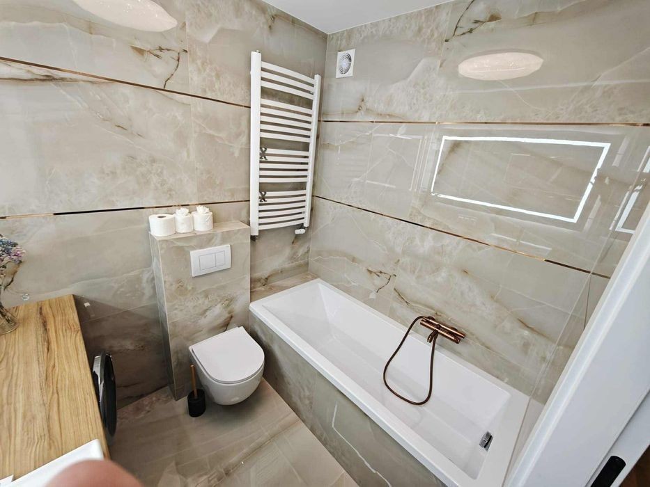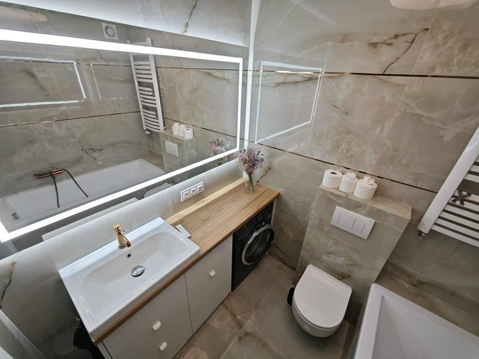 Do wynajęcia 2-pokojowe mieszkanie na Białołęce - osiedle Aura Garden wideo: youtu.be/IyXk1sDDPI Nowoczesne, dwustronne mieszkanie o powierzchni 47 m², położone na spokojnym i zamkniętym osiedlu przy ul. Przejezdnej. Układ: • salon z aneksem kuchennym (zmywarka, lodówka, piekarnik) • sypialnia z dużym łóżkiem • łazienka z wanną i pralką • przedpokój z miejscem do przechowywania Atutem mieszkania są dwa ogródki - jeden z wyjściem z salonu, drugi z dostępem z sypialni. Lokalizacja: • 6 min spacerem do przystanku autobusowego „Przejezdna 02” (linie 120, 314, N14) • w pobliżu sklepy, restauracje, przedszkole, szkoła, apteka • 10 min autem do CH Atrium Targówek, 12 min do Factory Annopol Cena wynajmu: 2700, plus 800 czynsz + media Kaucja 4000