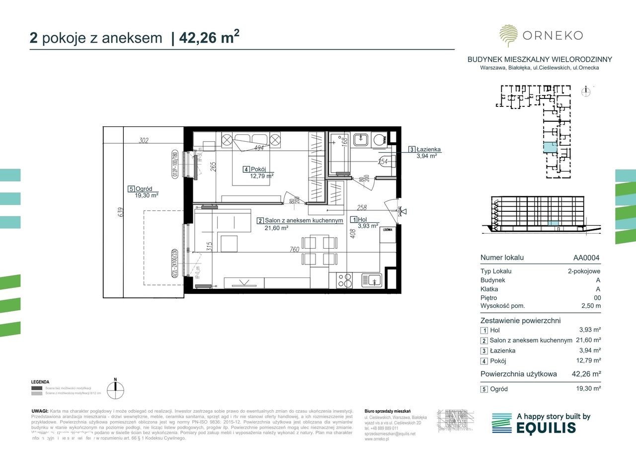2-pokojowe mieszkanie numer AA0004 na parterze w budynku A w Inwestycji Orneko Dewelopera Equilis Poland Services Osiedlowy paczkomat Parkingi oraz stacje ładowania Wspólny ogródek sąsiedzki Białołęka, ul. Cieślewskich / Ornecka Istotne punkty w okolicy inwestycji