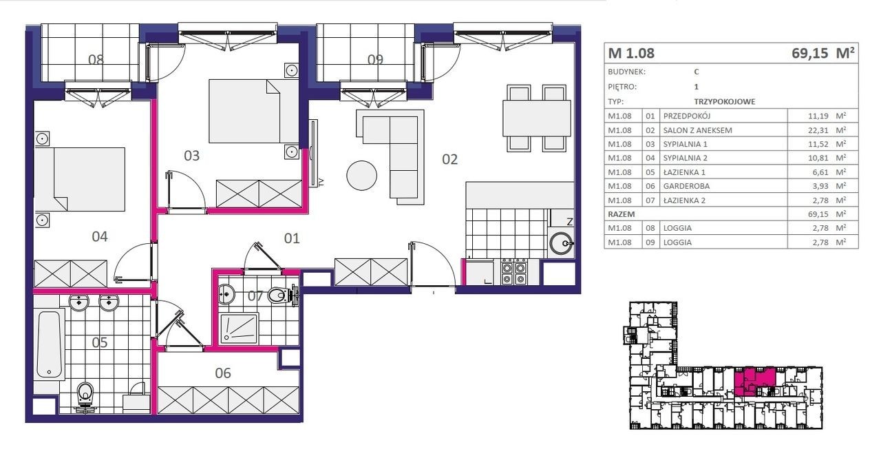 0% PCC i 0% PROWIZJI Na sprzedaż nowe mieszkanie 3 pokojowe o pow. 69,15 m2. Mieszkanie usytuowane jest na 1 piętrze w 8 piętrowym budynku. Wysokość mieszkania 2,75 cm. Okna wychodzą na spokojną część osiedla, na wschód. Mieszkanie posiada dwie łazienki, dwie loggie i garderobę. Zakończenie budowy II kwartał 2026 r.