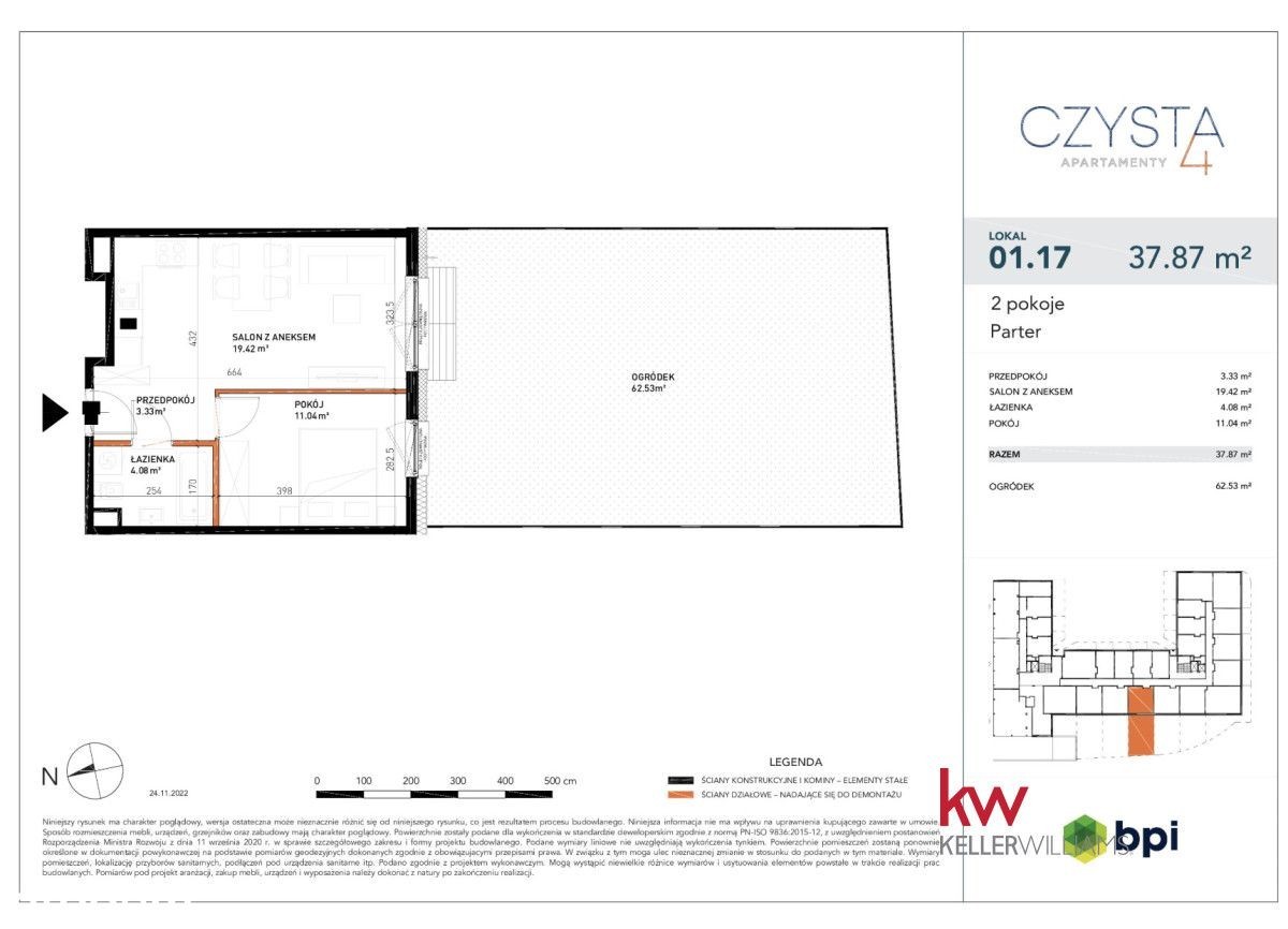 Prestiżowa lokalizacja, mieszkanie w ścisłym centrum, tuż przy Rynku - wygoda i miejski styl życia na wyciągnięcie ręki! Zapraszam do zapoznania się z wyjątkową ofertą 2-pokojowego mieszkania 37,72 m2 Dobrze doświetlony apartament na parterze z ogródkiem składający się z: • Salon z aneksem kuchennym 19,42 m2 • Pokój 11,04 m2 • Łazienka 4,08 m2 • Hol 3,33 m2 • Ogródek 62,53 m2 Lokalizacja Ścisłe centrum, przy ul. Czystej na wrocławskim Starym Mieście Czysta 4 to prestiżowa inwestycja mieszkaniowa we Wrocławiu, łącząca nowoczesną architekturę z funkcjonalnością. Budynek oferuje mieszkania z balkonami, tarasami lub ogródkami, a także podziemny parking, przestrzeń coworkingową i zielony dach do relaksu. Dzięki centralnej lokalizacji, mieszkańcy mają łatwy dostęp do Rynku, Dworca Głównego i licznych atrakcji kulturalnych. Atuty • wielofunkcyjna przestrzeń do pracy, życia i rekreacji w standardzie premium, • na parterze lokale usługowe, • spokojne otoczenie, bliskie otoczenie wrocławskiego rynku, • taras widokowy dostępny dla wszystkich mieszkańców, • liczne udogodnienia komunikacyjne, Możliwość zakupu miejsca postojowego w hali garażowej Idealne do zamieszkania lub na inwestycję - możliwość skorzystania z kompleksowej usługi zarządzania najmem W ramach inwestycji dostępne są mieszkania o różnych metrażach - od 30 m² do 54 m². mieszkanie gotowe do obioru Cena 814 752zł 0% prowizji 0% PCC Bezpłatnie udzielamy wsparcia w zakresie finansowania. Zapraszam do kontaktu i na prezentację! Keller Williams Quality Skontaktuj się! ul. Partynicka 27b 53-031 Wrocław Powyższy opis ma charakter informacyjny i nie stanowi oferty w rozumieniu przepisów Kodeksu Cywilnego. / /