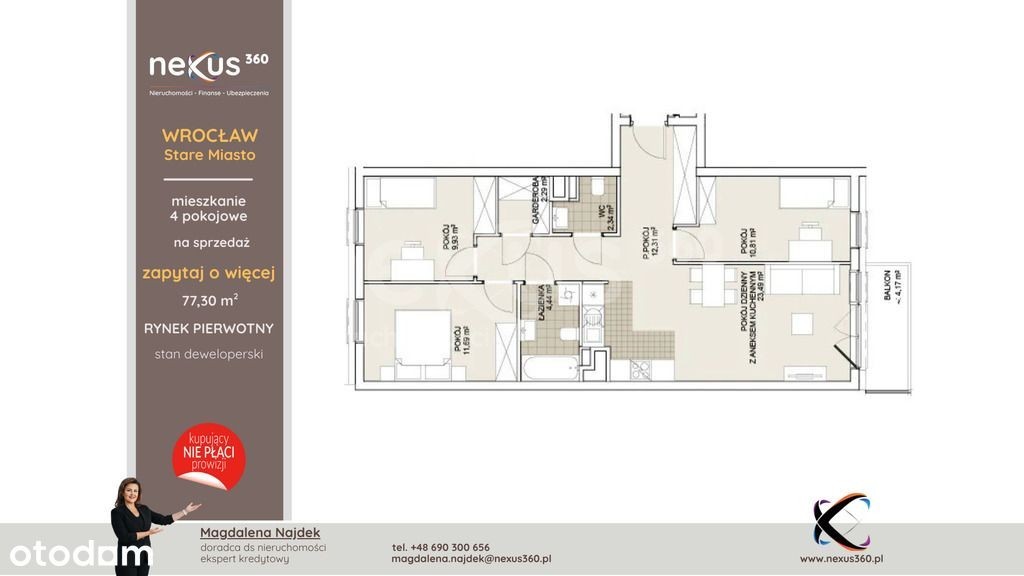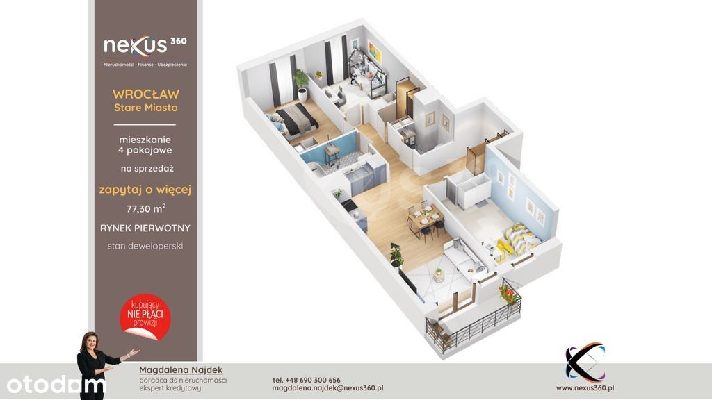 Wrocław, Stare Miasto - 4 pokoje 77,30 m2 | balkon 4,17 m2 | garderoba | gotowe od ręki | Osiedle Porto Szukasz przestronnego mieszkania w sercu miasta, a jednocześnie blisko zieleni nad Odrą? Ten 4‑pokojowy lokal w inwestycji Porto łączy wygodę miejskiego życia z kameralnym klimatem nowoczesnego osiedla. Jeśli potrzebujesz innego metrażu lub układu - w tej inwestycji dostępny jest duży wybór mieszkań 4‑pokojowych od 73,4 m2 do 110,1 m2. Zadzwoń po aktualną listę lokali (różne piętra i ekspozycje). Skontaktuj się chcesz poznać szczegóły, rzuty, dostępność innych metraży i układów mieszkań na tym osiedlu. Zadzwoń lub napisz - chętnie pomogę wybrać najlepsze mieszkanie dla Ciebie.