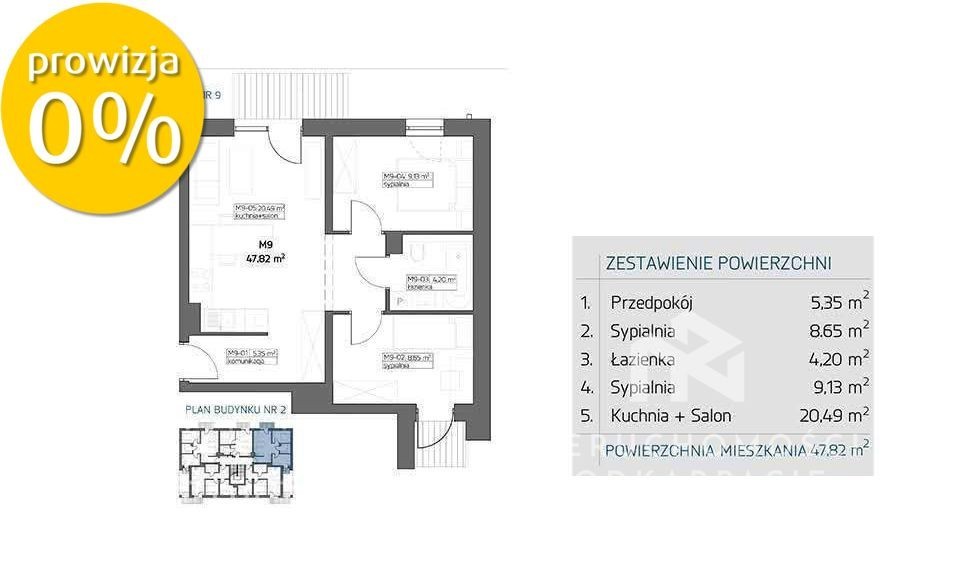 Biuro Nieruchomości Podkarpacie ma przyjemność przedstawić Państwu ofertę sprzedaży trzypokojowego mieszkania (B1M9) o powierzchni 47,82 m² zlokalizowane na pierwszym piętrze w budynku dwupiętrowym w Rzeszowie przy ul. hr. Alfreda Potockiego osiedle Załęże. Mieszkanie składa się: ➣ przedpokój, ➣ dwie sypialnie, ➣ kuchnia + salon, ➣ łazienka, ➤ Do mieszkania przynależą dwa ➤ Do każdego z mieszkań przyporządkowane jest o wymiarach 250 x 500 cm. ➤ Jest możliwość zakupu większego miejsca postojowego o wymiarach 360 x 500 cm z dopłatą 5 000 zł. ➤ w stanie deweloperskim wraz miejscem postojowym to kwota: ➣ opłata przyłączeniowa za wykonanie przyłączenia wody, prądu, gazu wraz z licznikami oraz opłata za kanalizację sanitarną i kanalizację deszczową. ➣ Łączna kwota za przyłącze to: ➣ o wymiarach 250 x 500 cm w cenie 22 000 zł, a większe miejsce postojowe o wymiarach 360 x 500 cm w cenie 25 000 zł. Dostępna. W bliskim sąsiedztwie inwestycji usytuowane są: ➣ Sklep spożywczy Żabka - odległość 400 metrów. ➣ Szkoła Podstawowa nr 6 w Rzeszowie - odległość 1000 metrów. ➣ Sklep spożywczy Delikatesy Centrum - odległość 800 metrów. ➣ Rzeszowski Dom Kultury - odległość 1500 metrów. ➣ Kościół Katolicki - odległość 1500 metrów. Osiedle znajduje się w atrakcyjnej i spokojnej i zielonej części miasta. Lokalizacja pozwala na dojazd do autostrady A4 i drogi ekspresowej S9 w kilka minut. W pobliżu osiedla znajduje się także dworzec PKP Rzeszów - Załęże Bardzo szybko można dostać się na lotnisko Jasionka, do którego kursuje także pociąg podmiejski. Chcesz dowiedzieć się więcej o ofercie ? Zadzwoń i umów się na prezentację: ✆