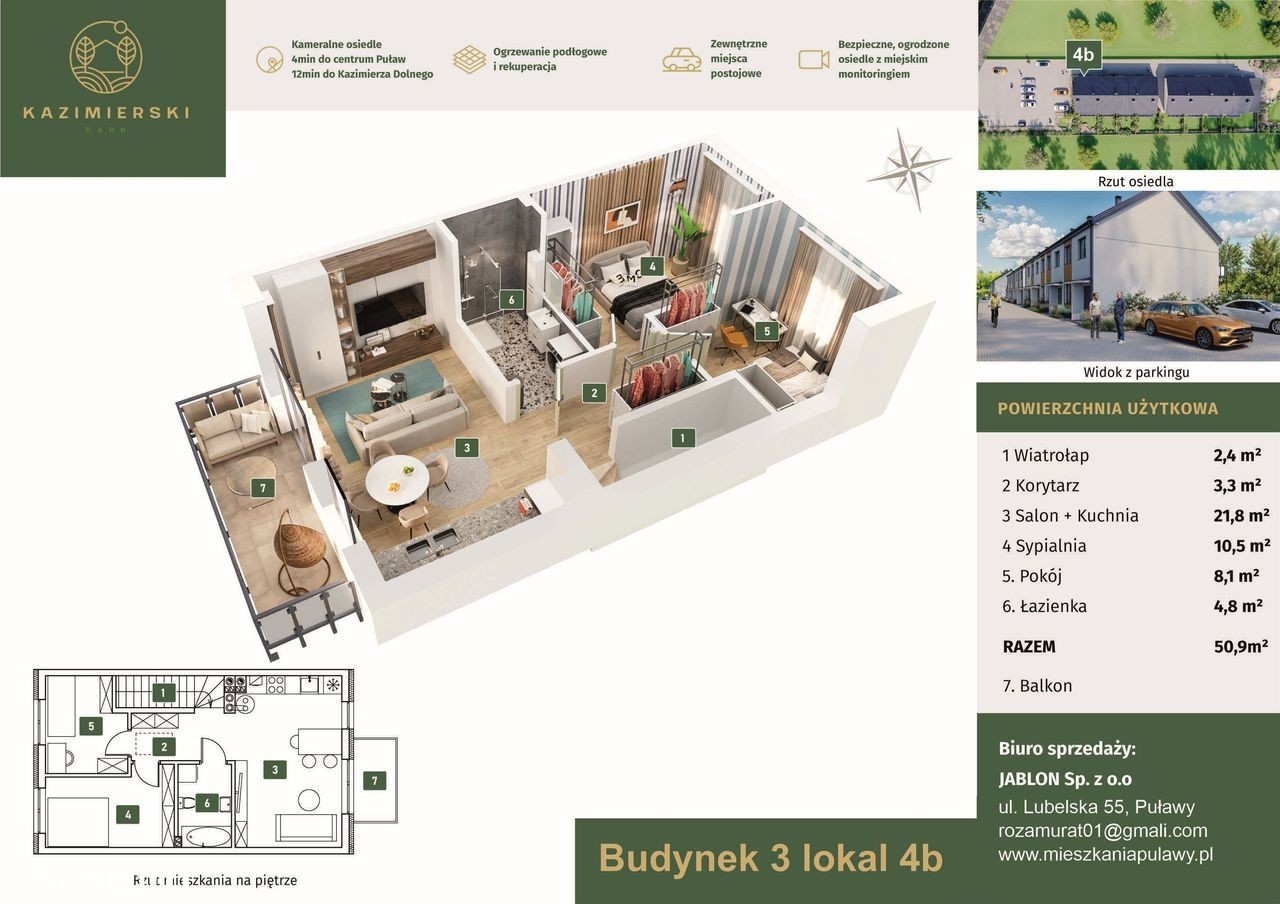 Twoje marzenie? Własny dom? Nasze wykonanie! Najlepsza cena na rynku! Jedyne w Puławach, bezpośrednio od dewelopera, przytulne mieszkanie 3 pokojowe na piętrze z balkonem, w zabudowie szeregowej, z metrażem 50.90 m2 plus poddasze (dodatkowe metry) do własnej aranżacji. Każde mieszkanie z osobnym wejściem! Własna przestrzeń, gwarancja spokoju oraz komfort dzięki energooszczędnemu, gazowemu ogrzewaniu podłogowemu, wysokiej jakości stolarce okiennej. Indywidualne opomiarowanie mediów.